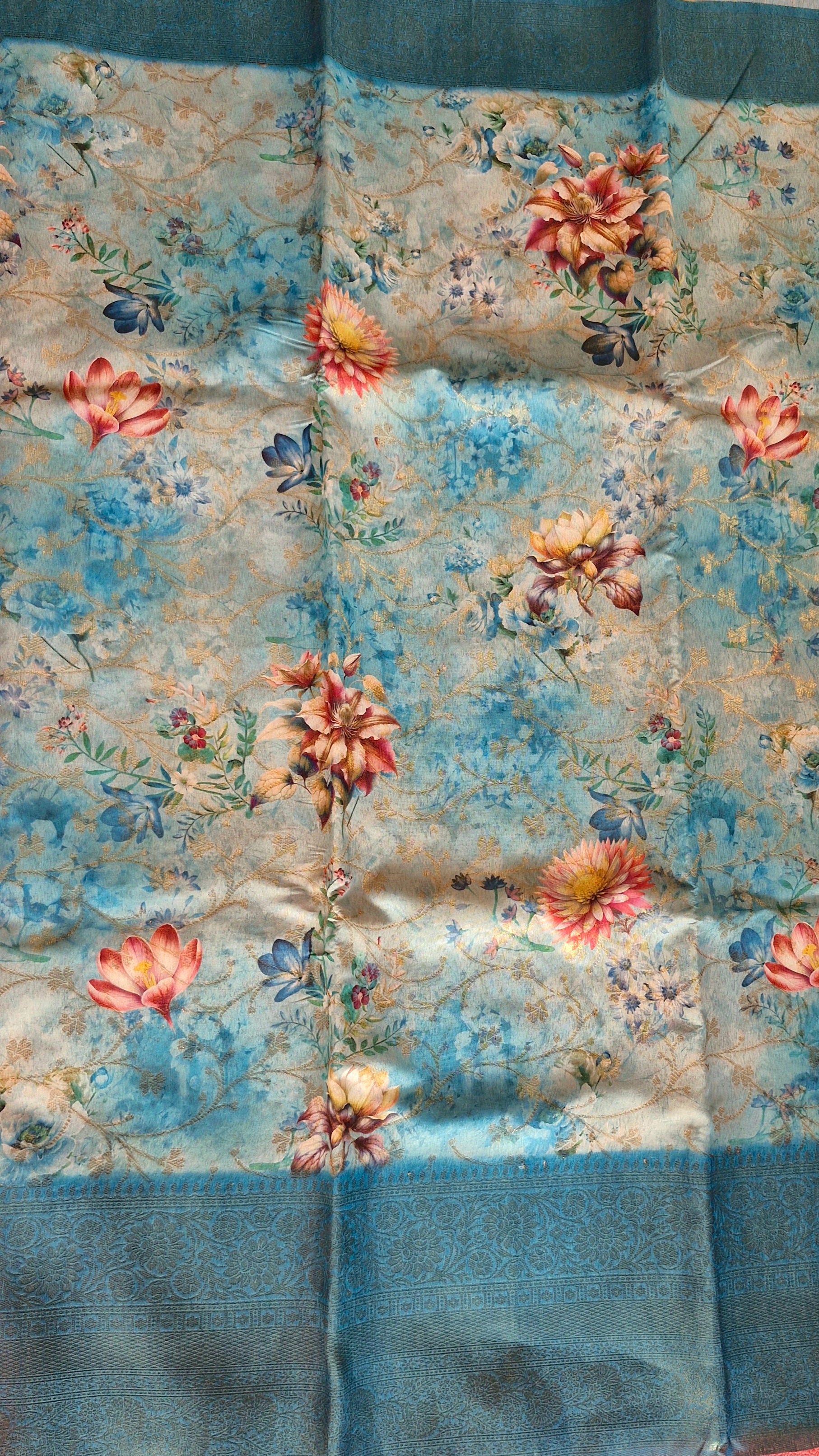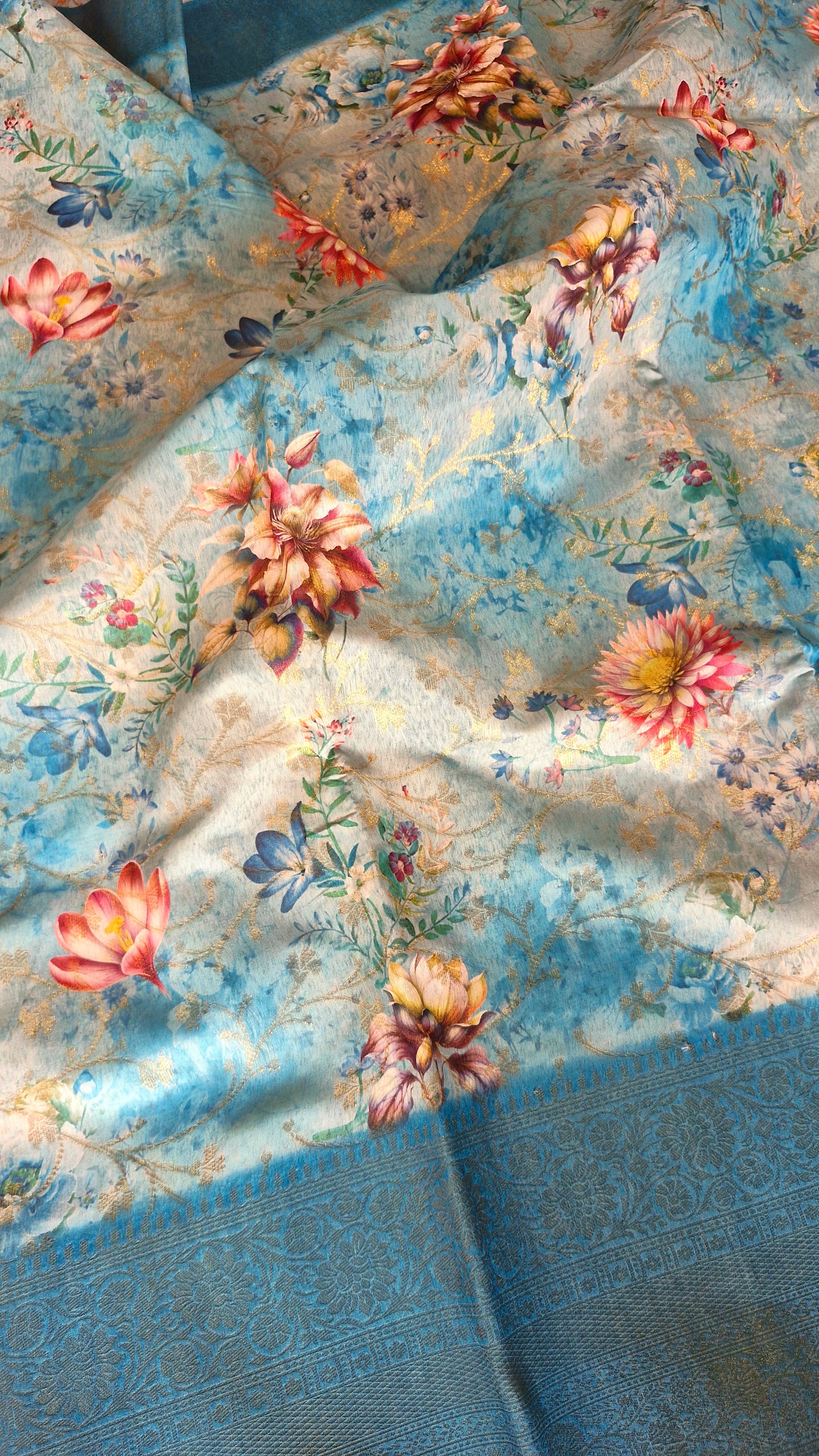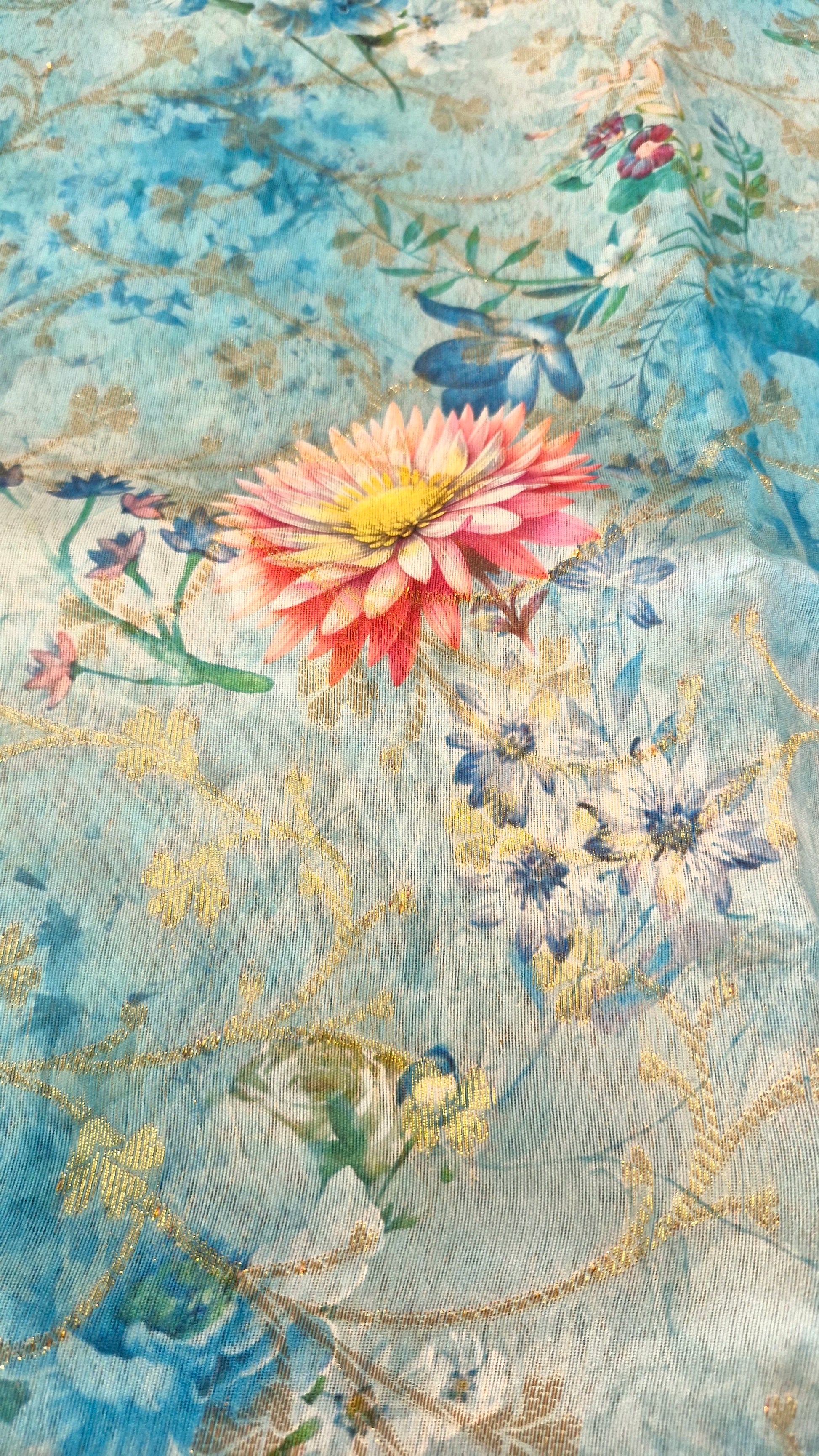 Exquisite and vibrant – this turquoise green organza saree with a digital floral print exudes a perfect blend of freshness and elegance.