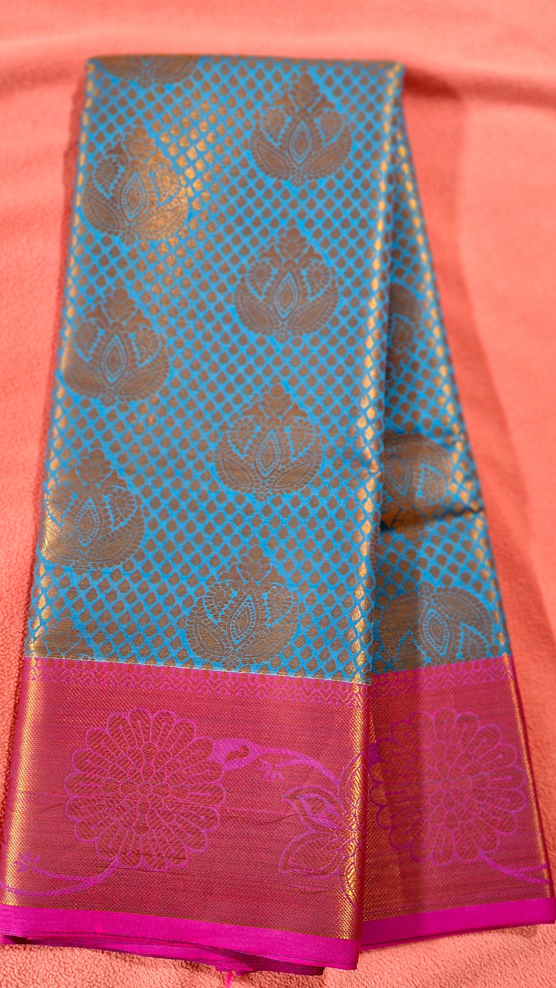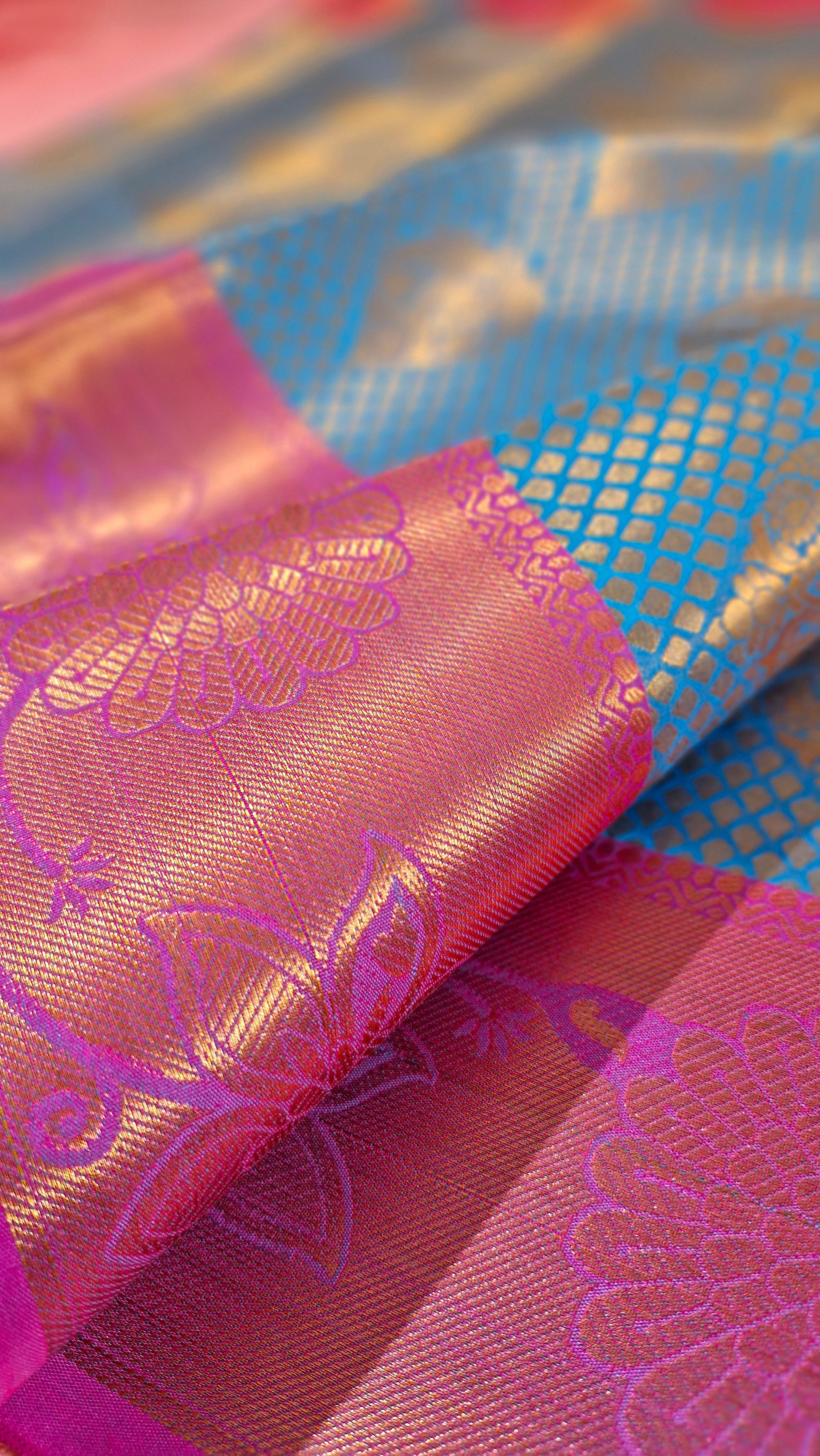 Breeze through elegance – this sky blue silk saree shines with golden palm motifs and a striking gold-magenta border.