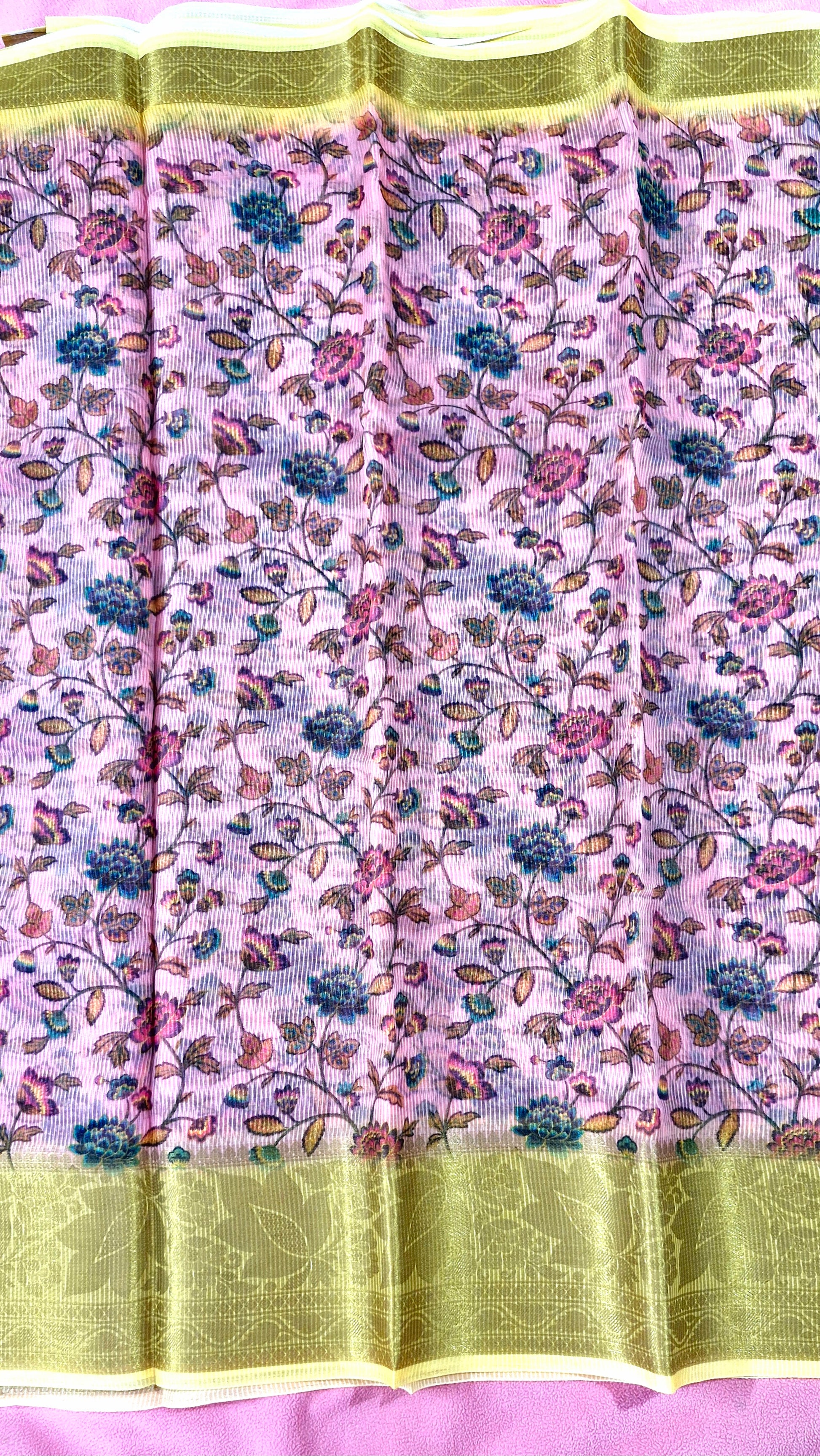 "Radiate soft elegance in this peach saree, featuring green-magenta florets and a golden border for a graceful, vibrant look."