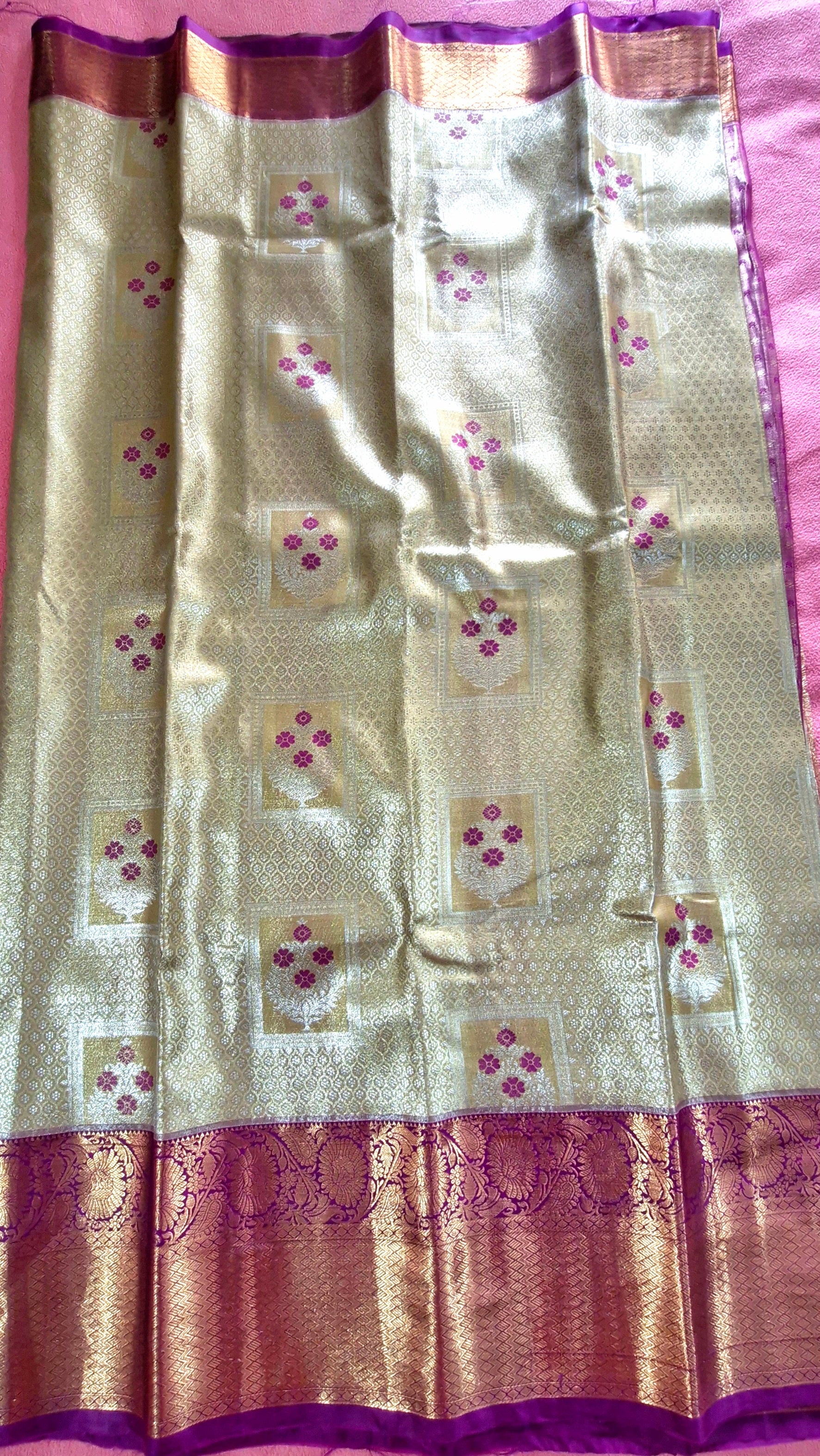 Elegant cream golden silk saree with delicate magenta motifs and a golden magenta border. A perfect blend of grace and vibrancy.