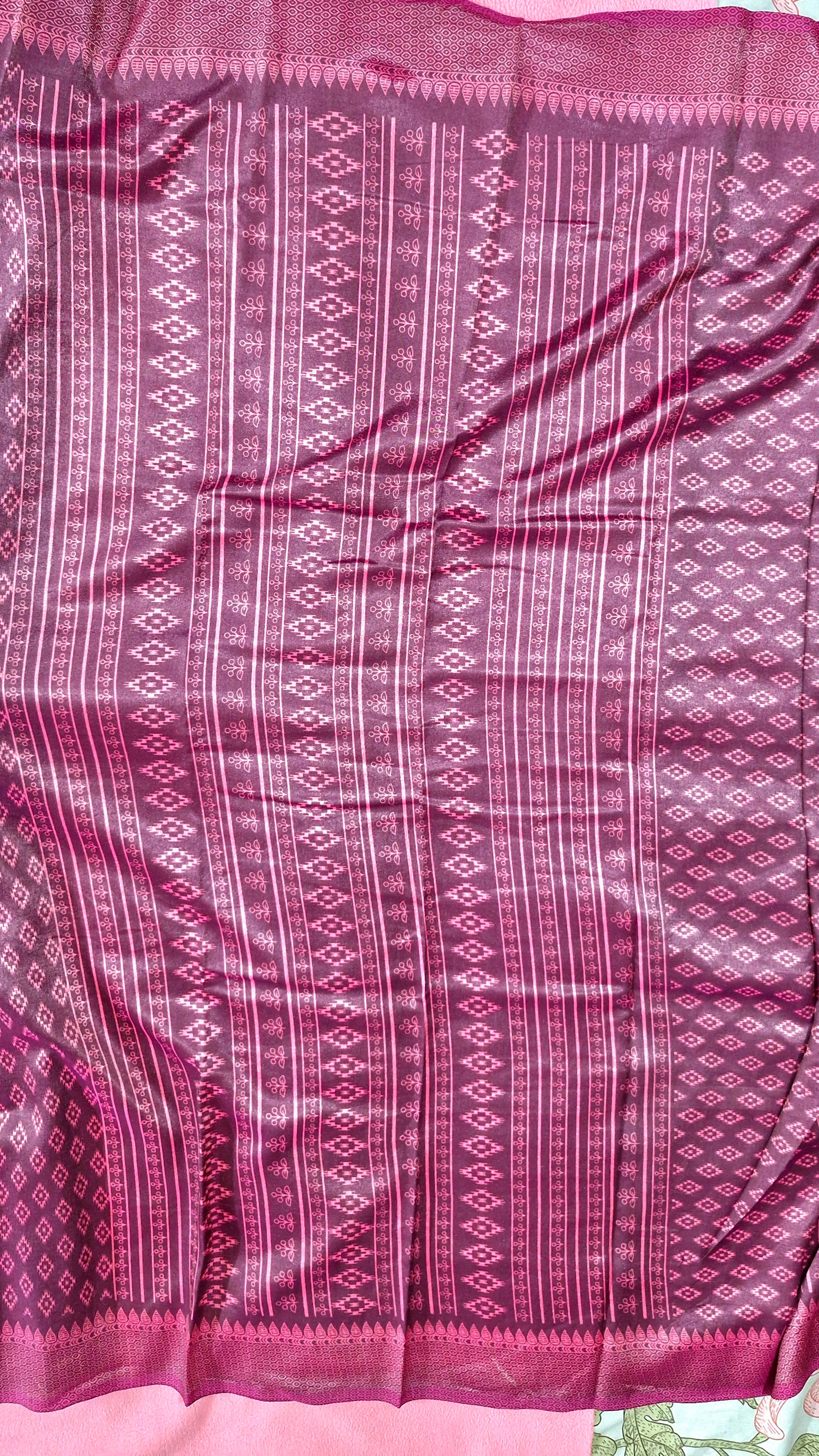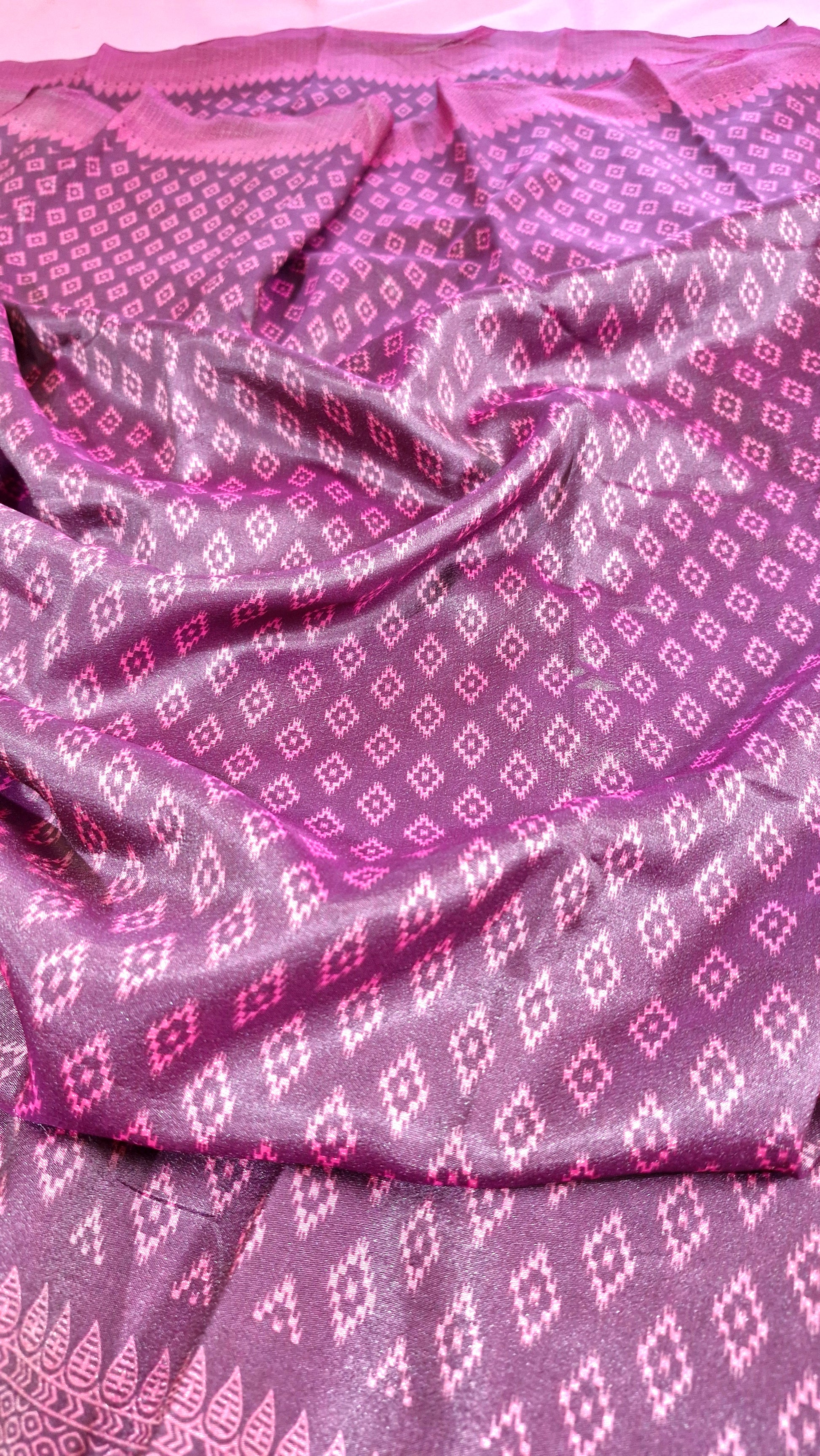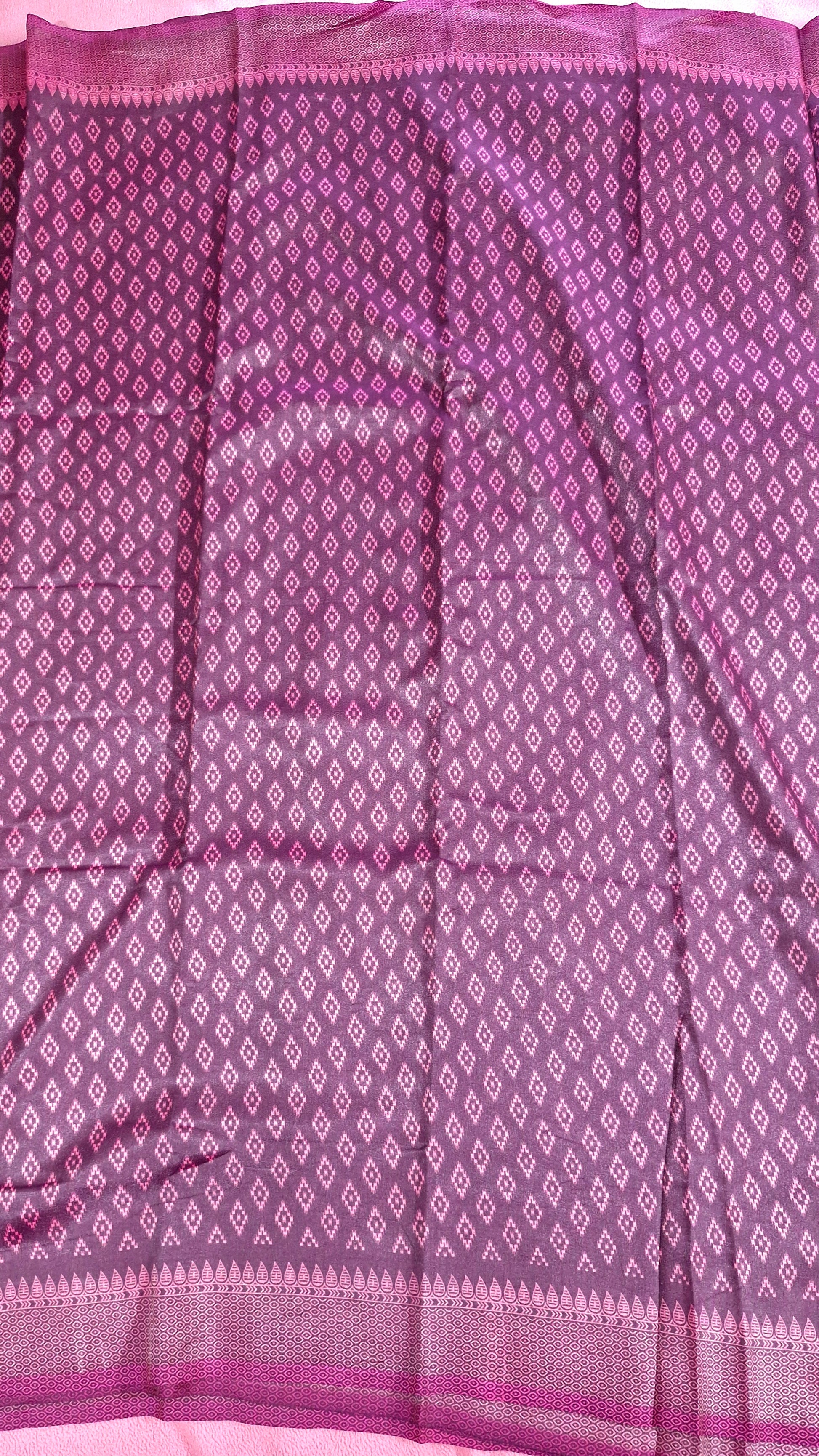 "Elegance meets luxury in this burgundy silk saree, adorned with delicate diamond motifs for a timeless, refined look."