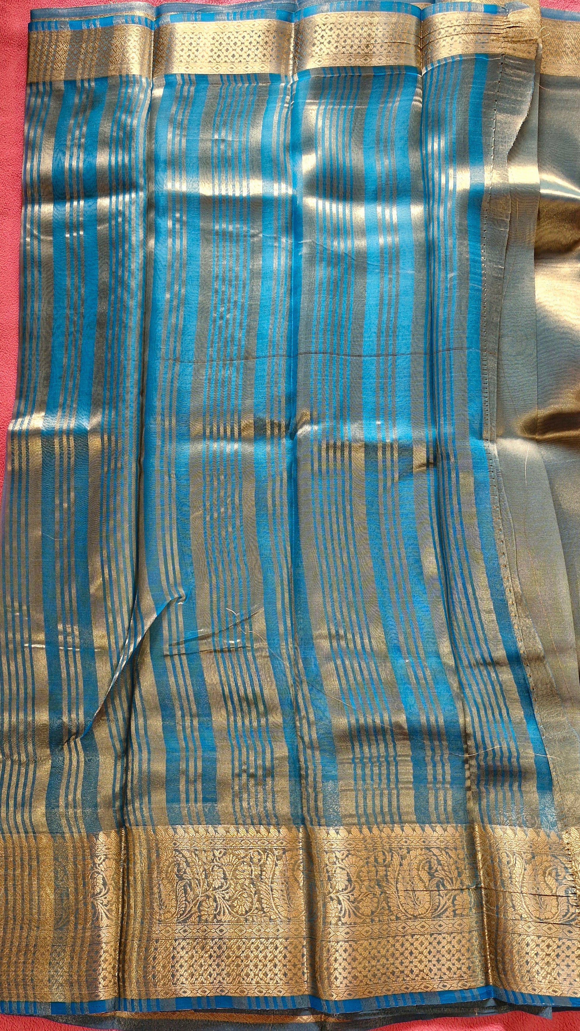 "Make a stunning statement in this turquoise organza saree, elegantly framed with a golden border for a refined, vibrant look."