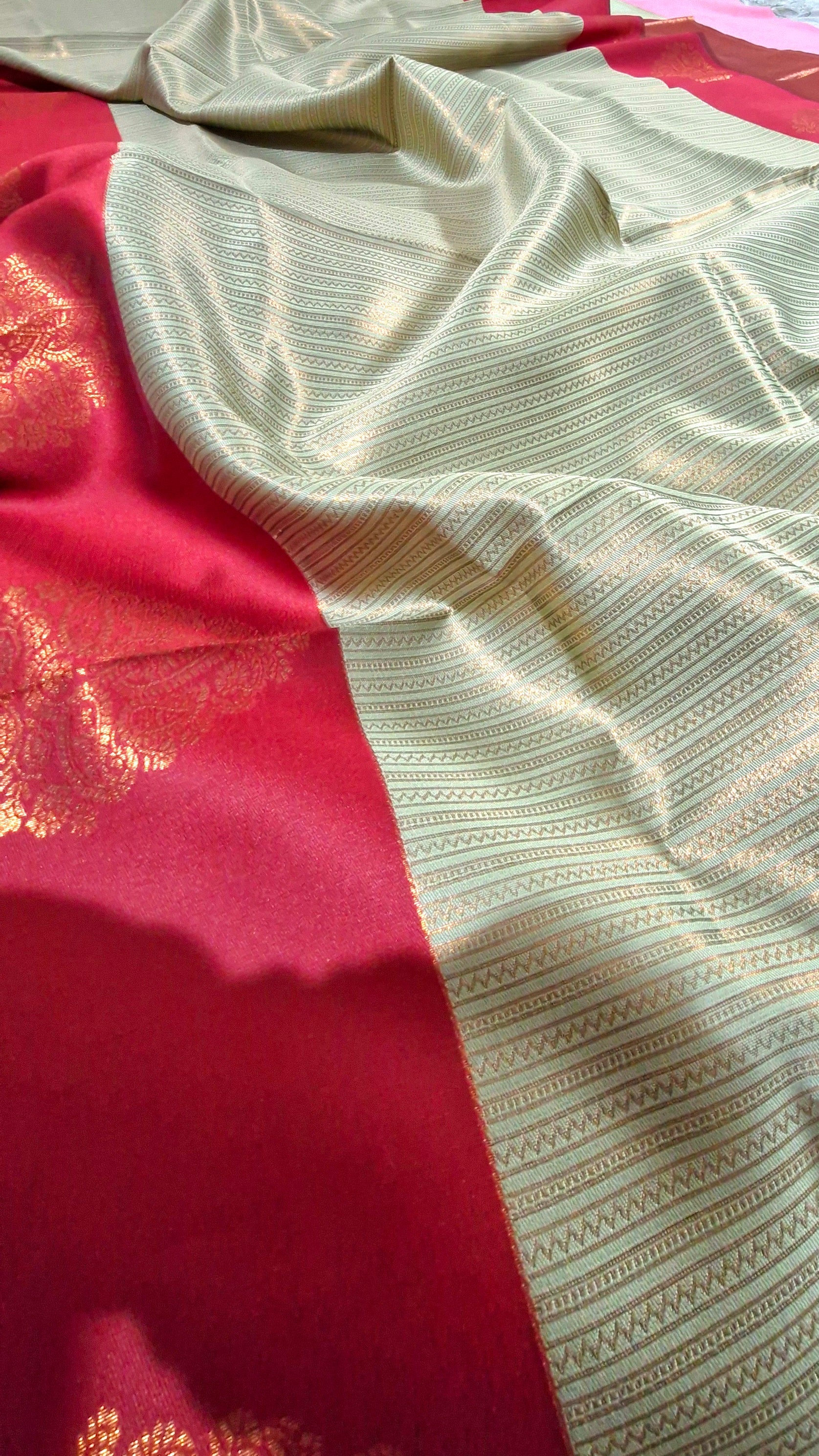 Elegant and radiant, this creamish golden silk saree dazzles with a golden zig-zag pattern, beautifully framed by a bold red border. A perfect blend of grace and tradition for special occasions.