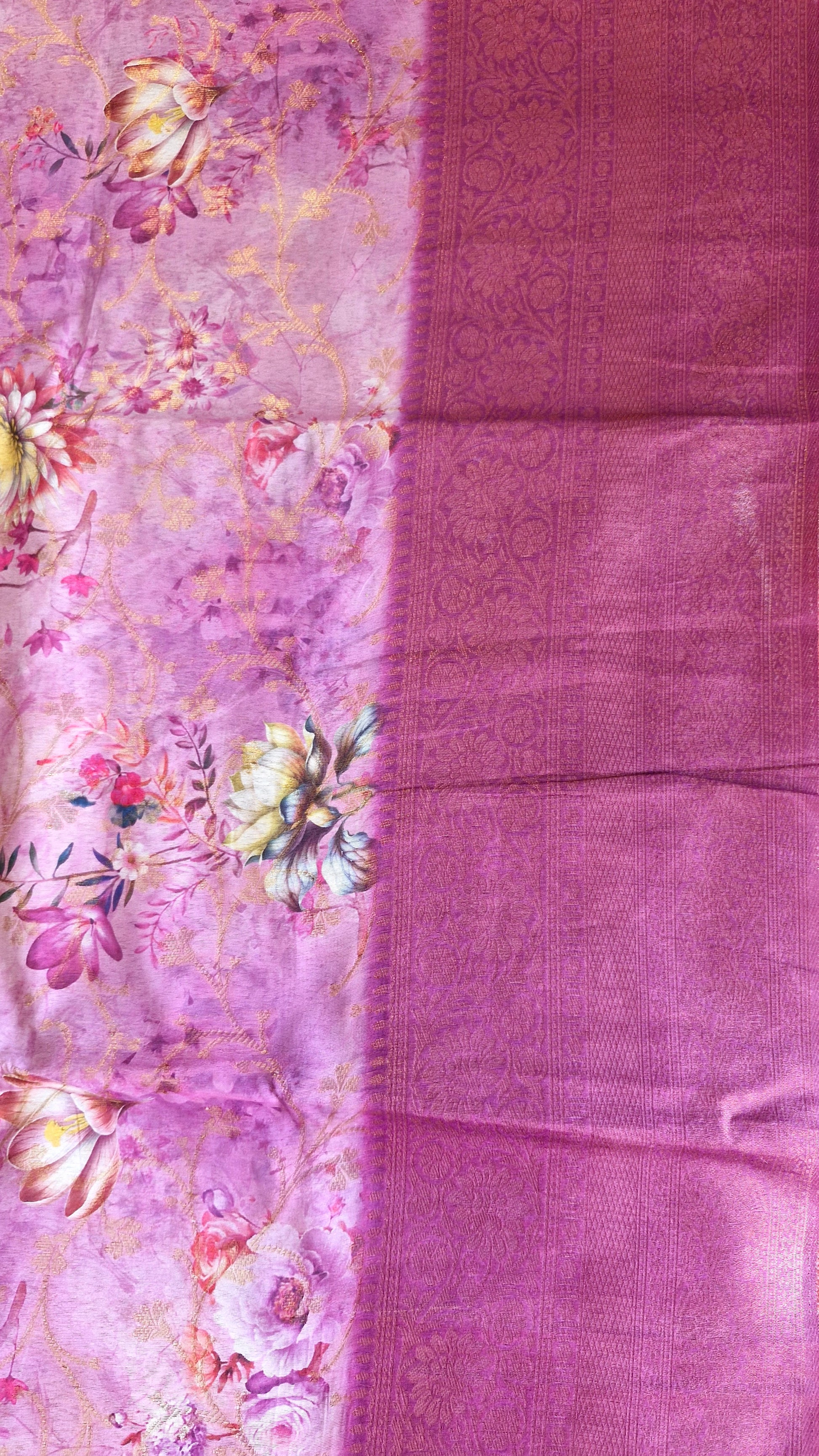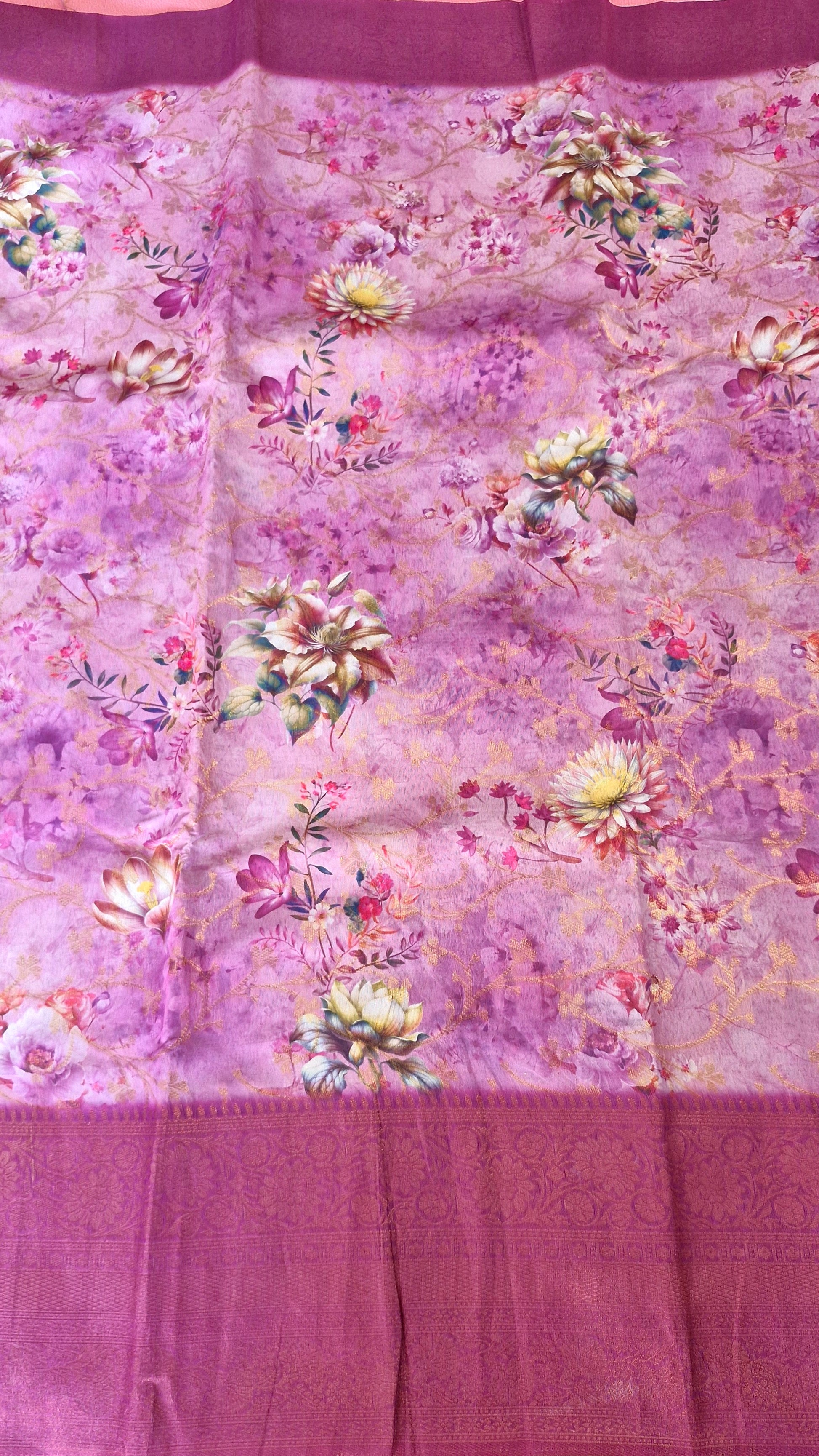 Elegant and feminine – this mauve organza saree with floral prints radiates softness and charm, perfect for any special occasion.