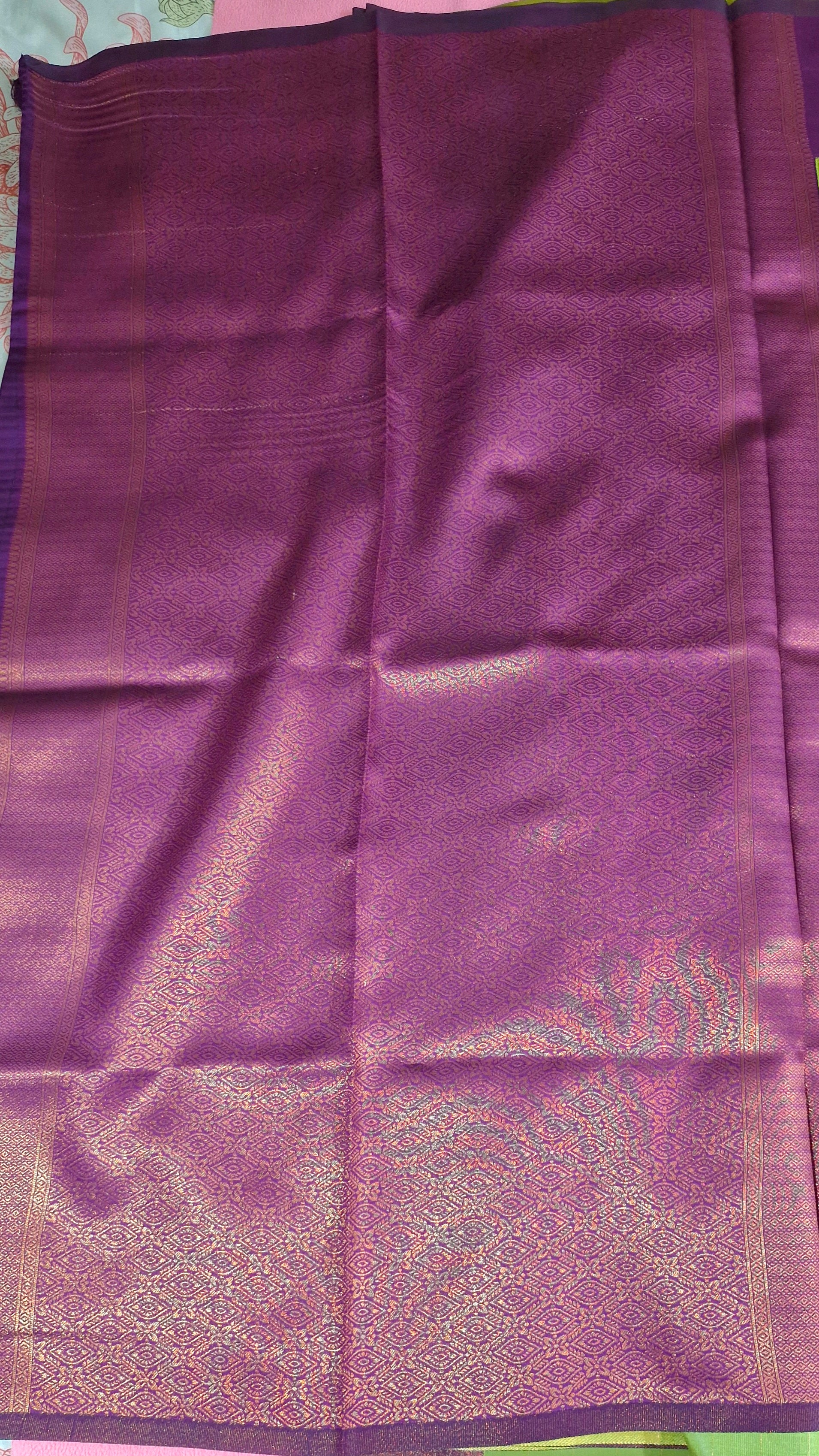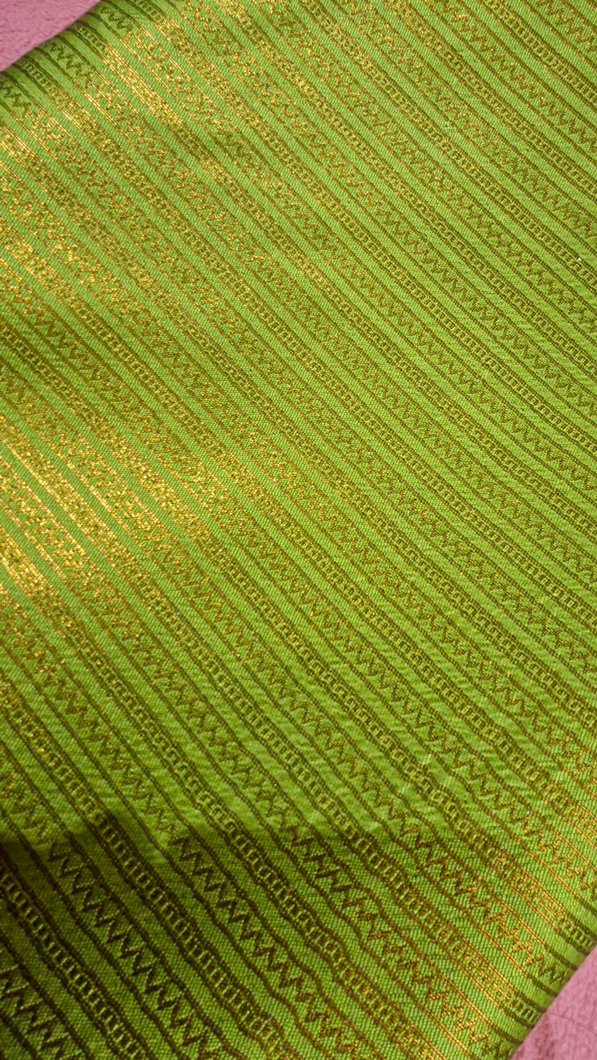 Vibrant and luxurious, this parrot green silk saree features a striking golden zig-zag design, perfectly complemented by a rich wine border. A bold choice for festive elegance and timeless charm.