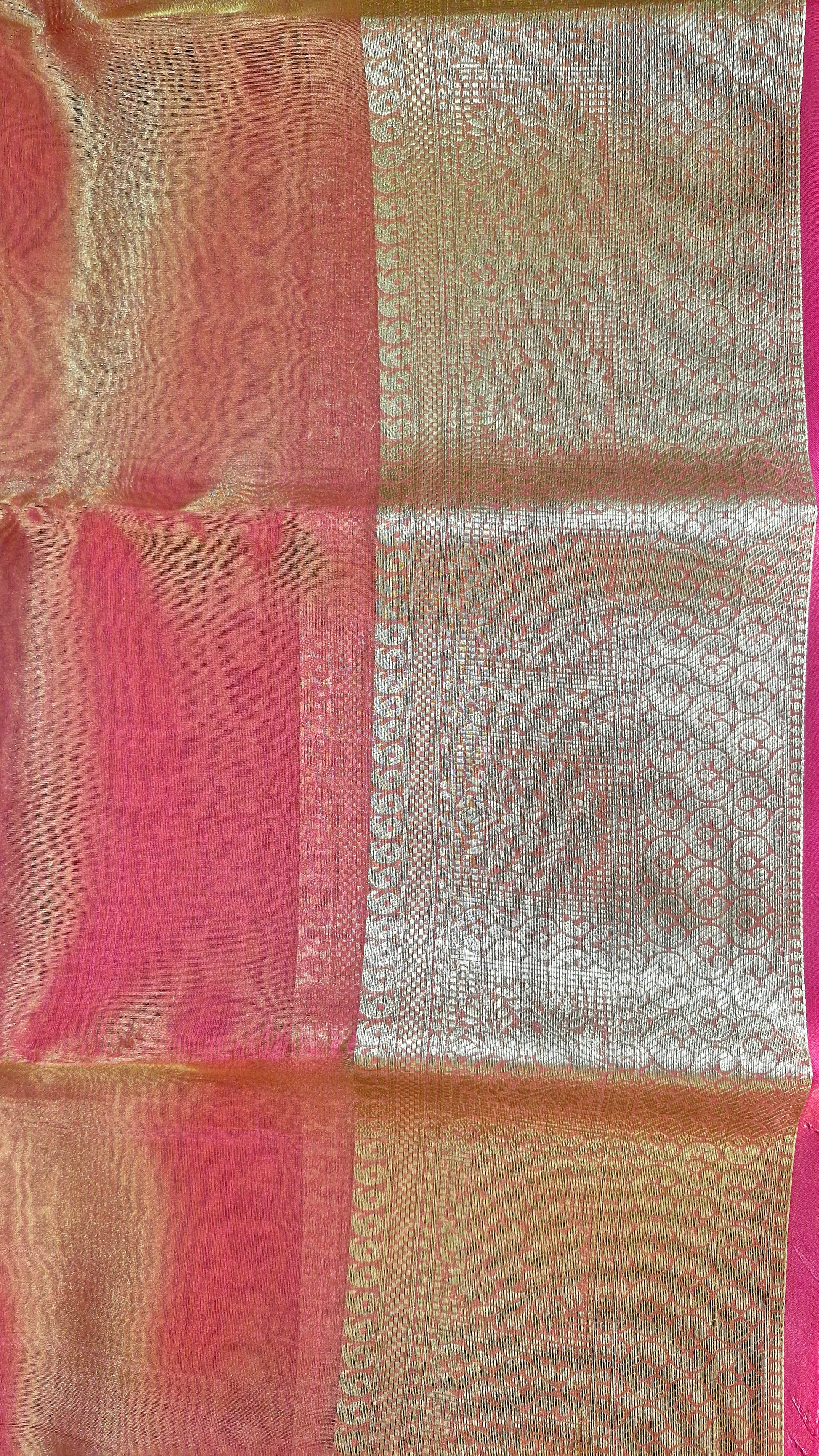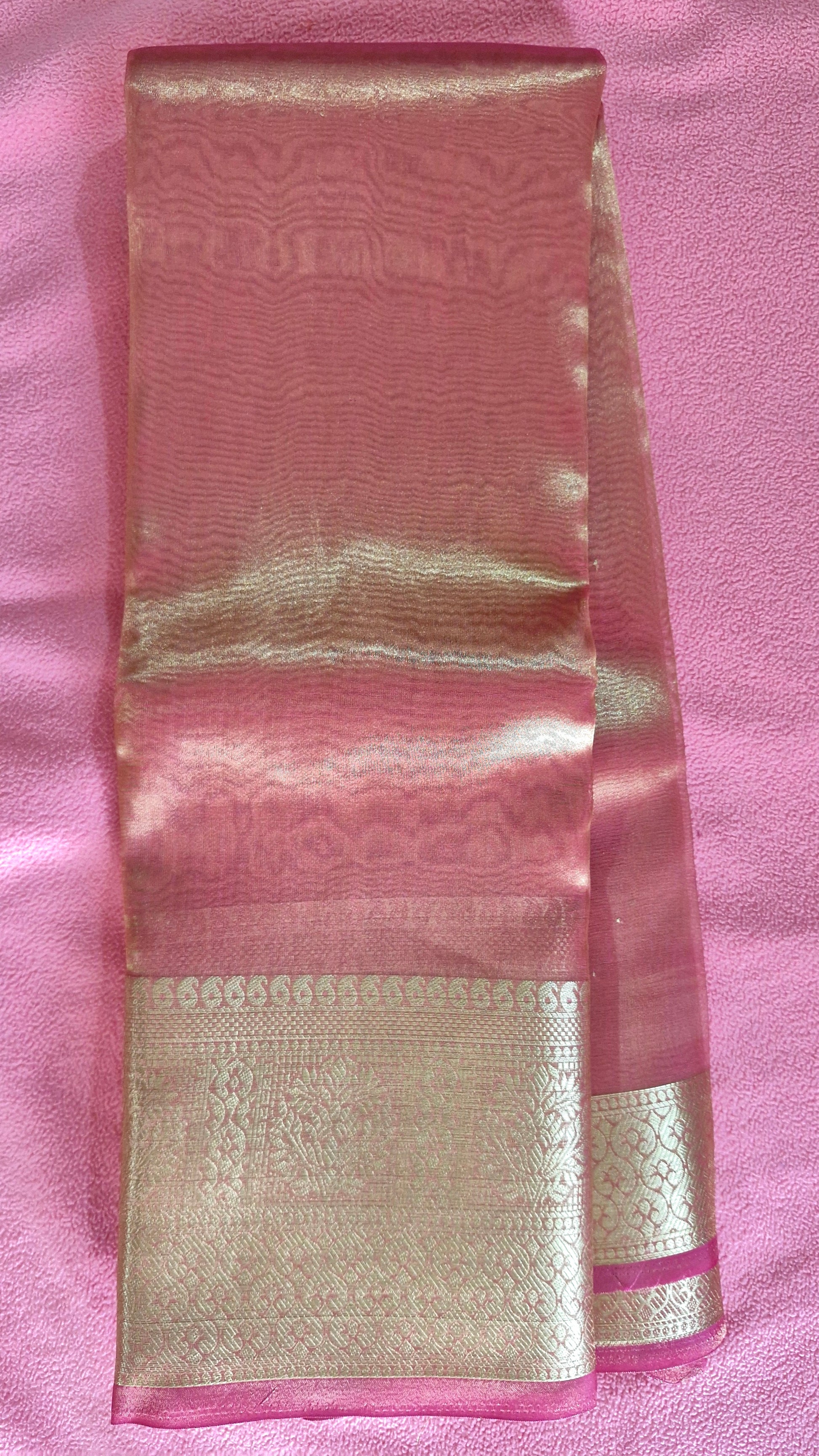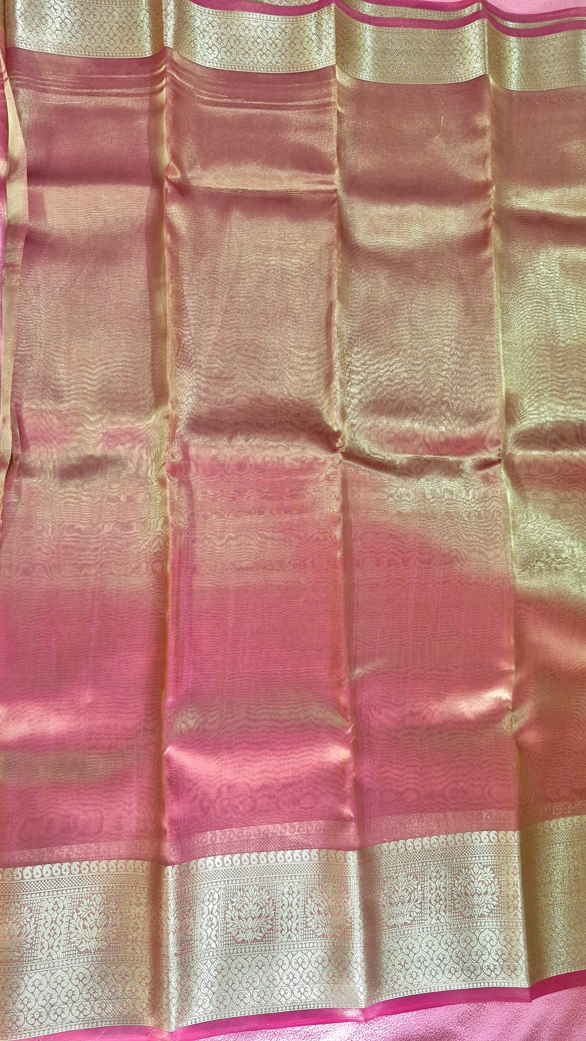 "Stand out in this pink ruby organza saree, featuring an elegant golden border for a bold yet refined look."