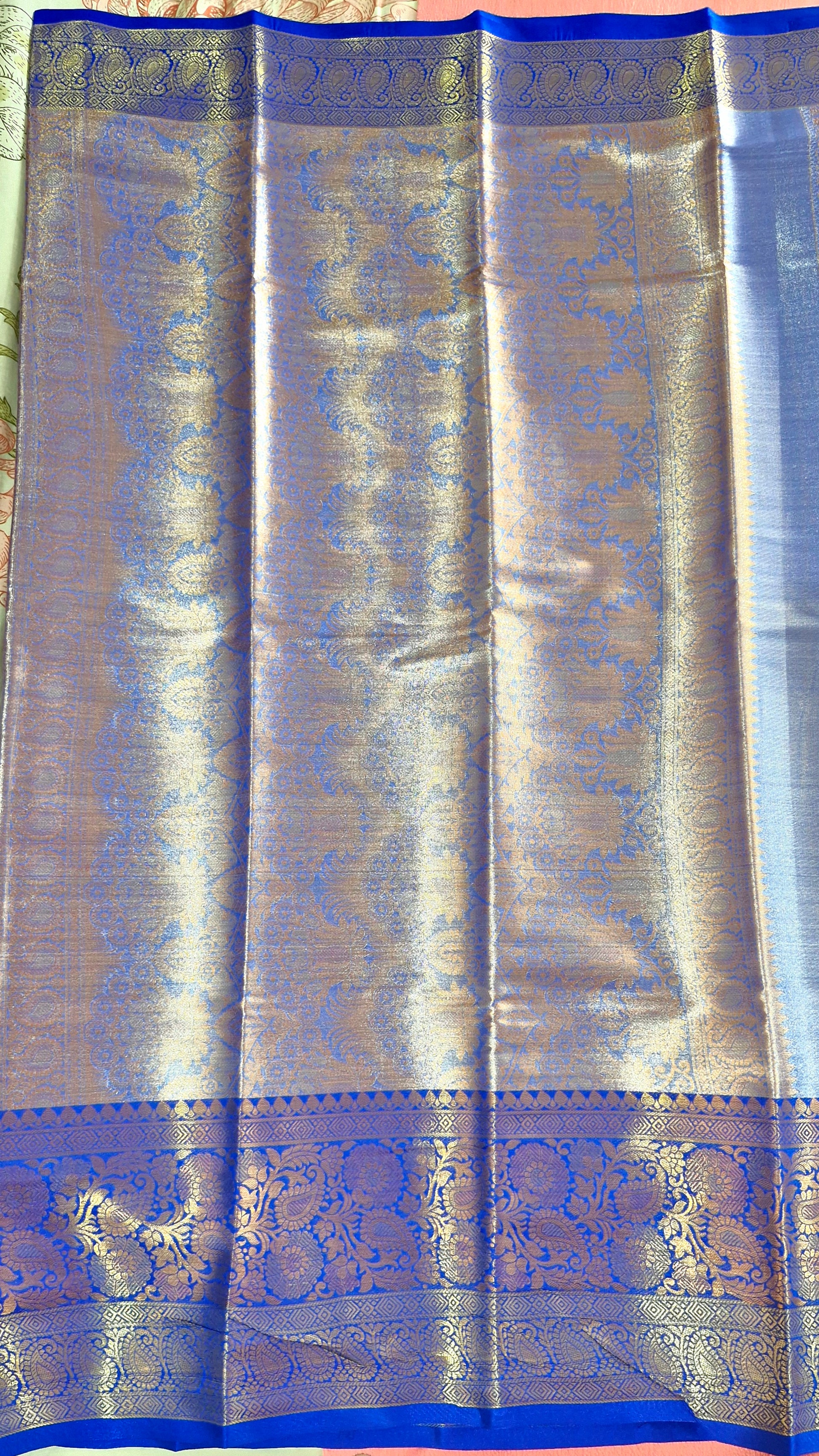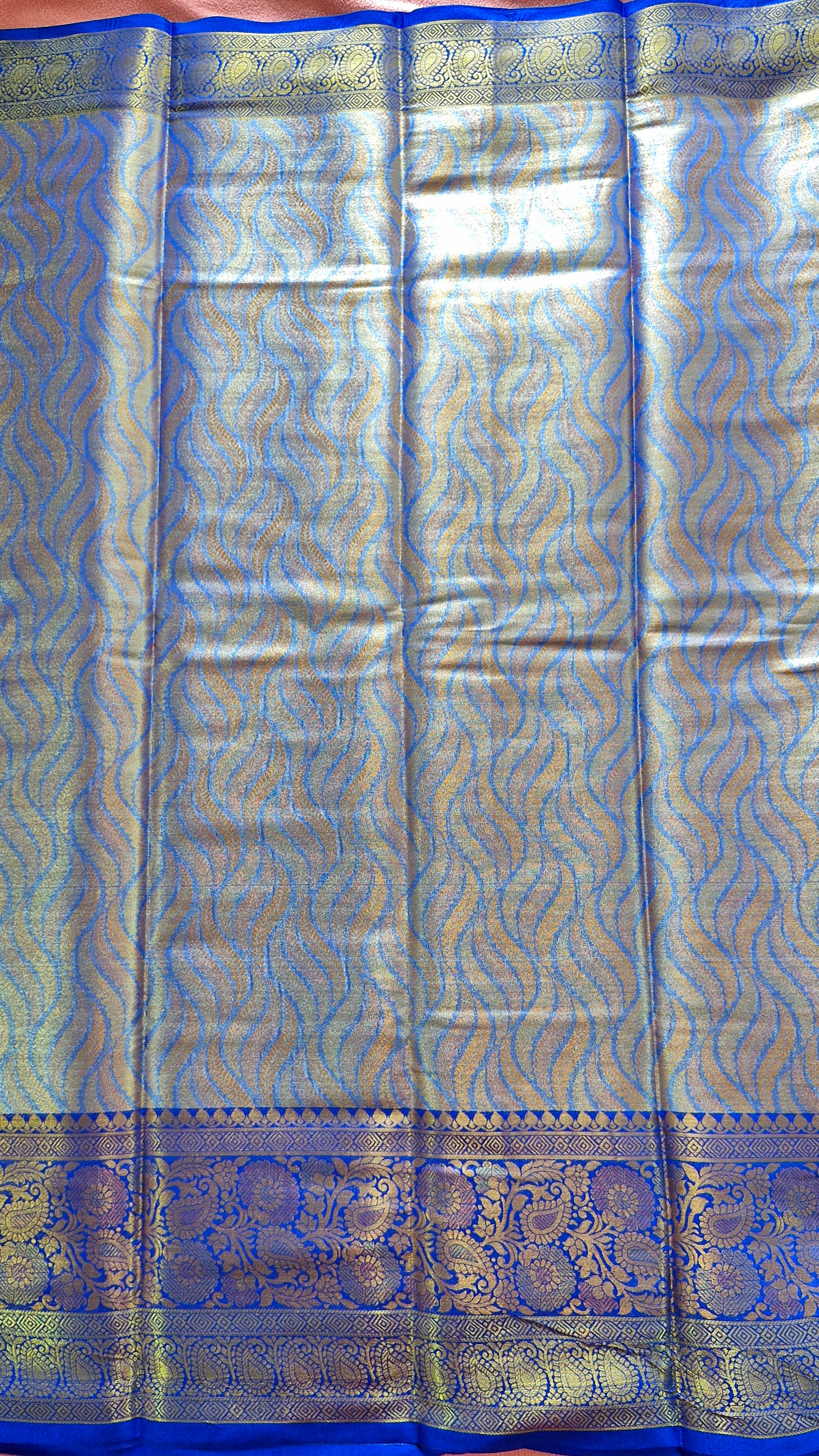 Sophisticated and graceful, this teal grey silk saree features a striking flame pattern, enhanced by a rich golden blue border. A perfect choice for understated elegance and charm.