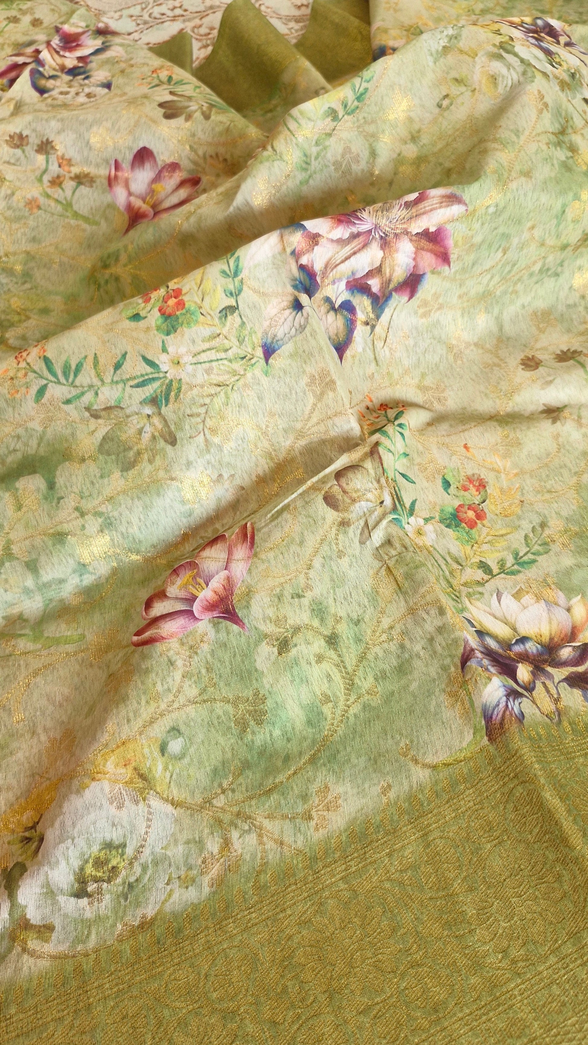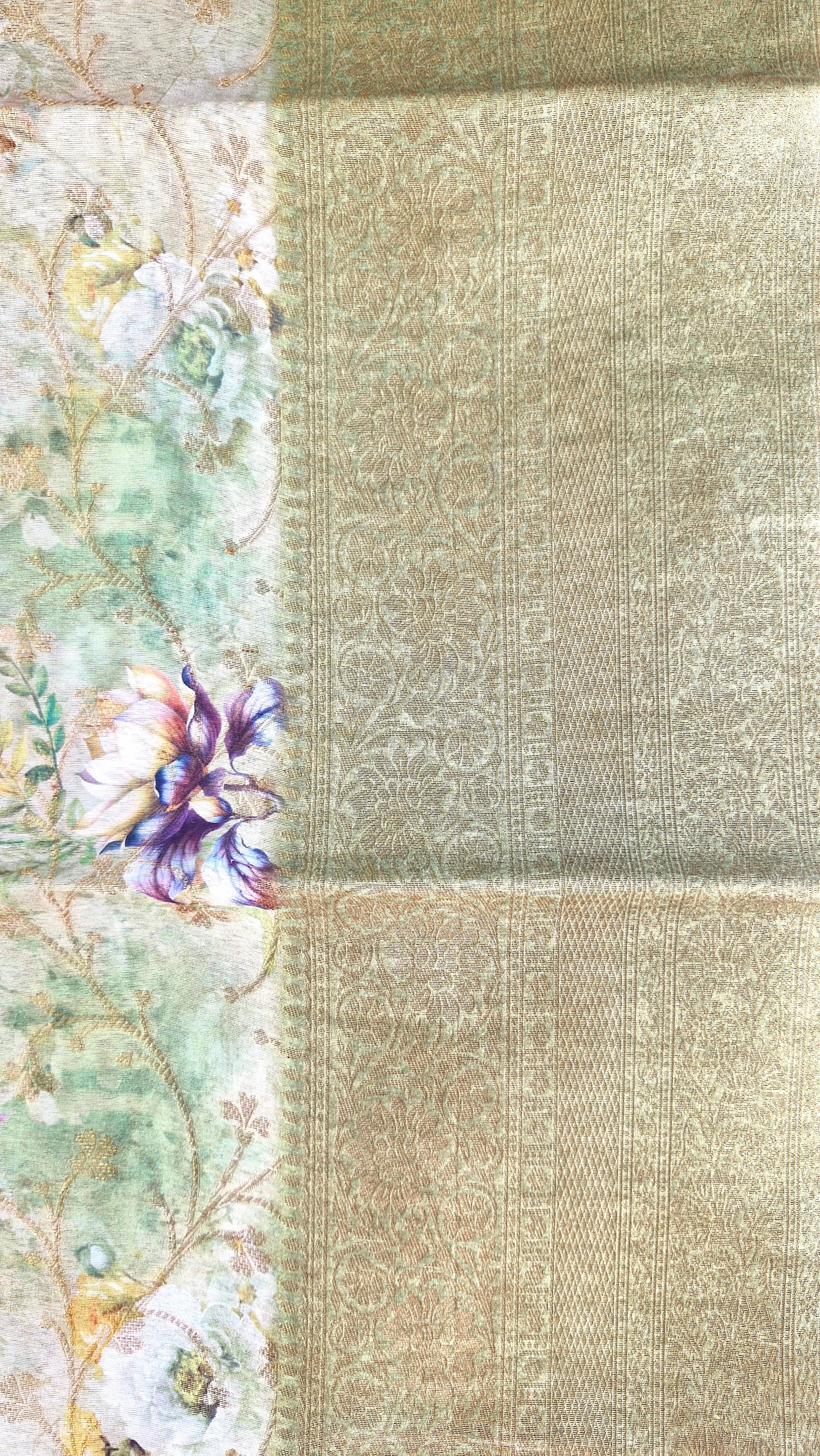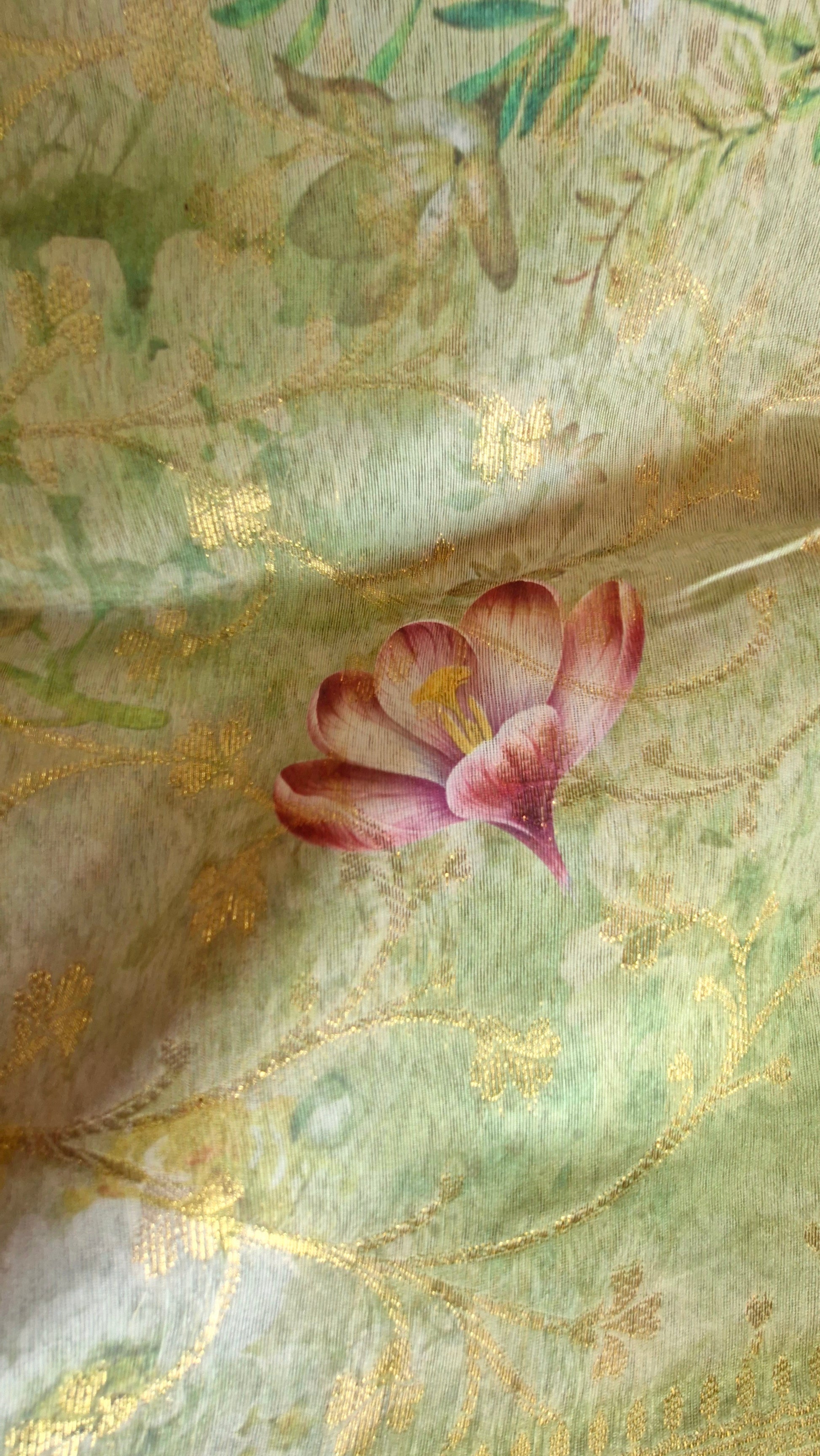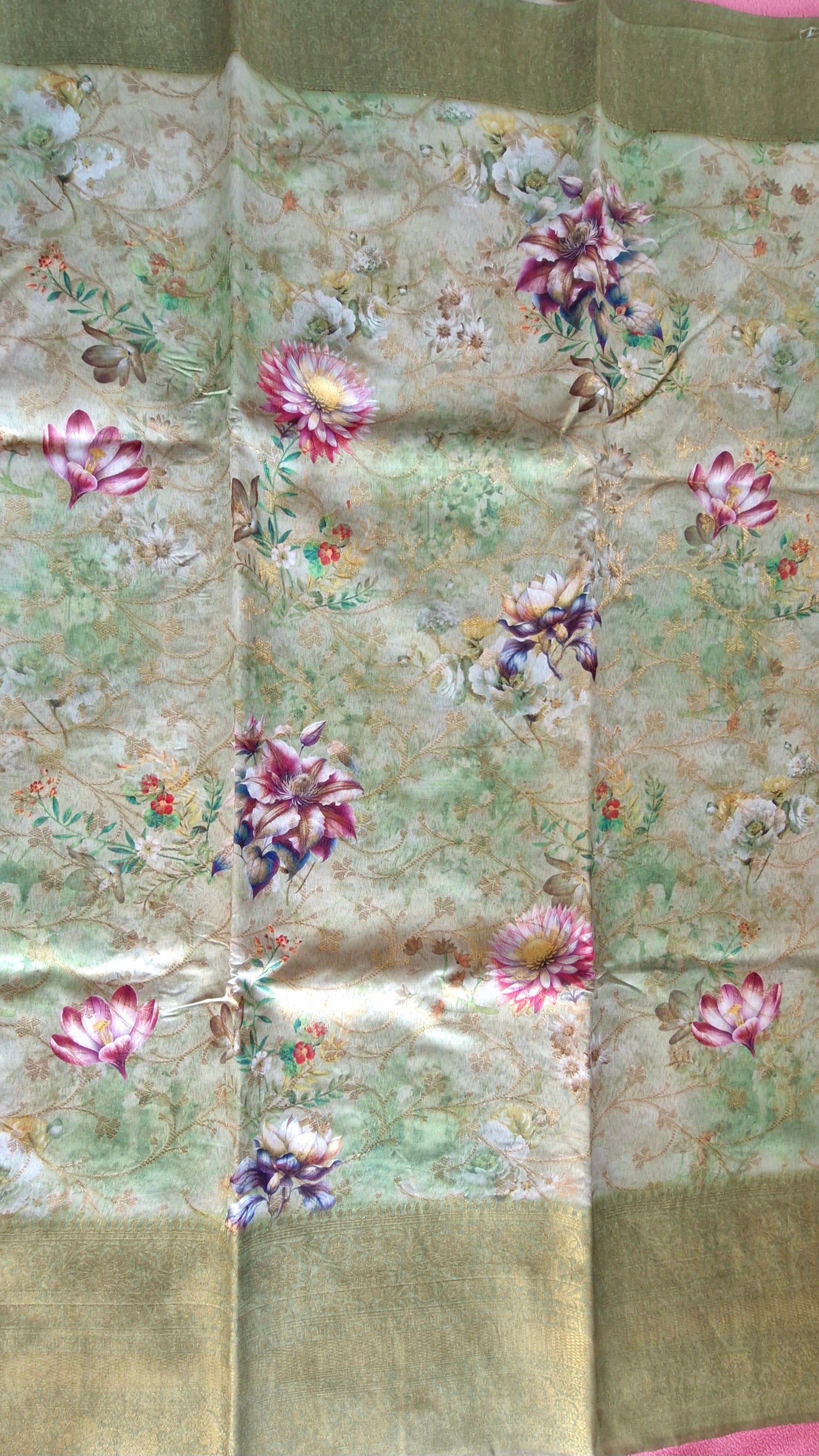 Soft and stunning – this pista green organza saree with a digital floral print brings a refreshing touch of elegance and modern charm.