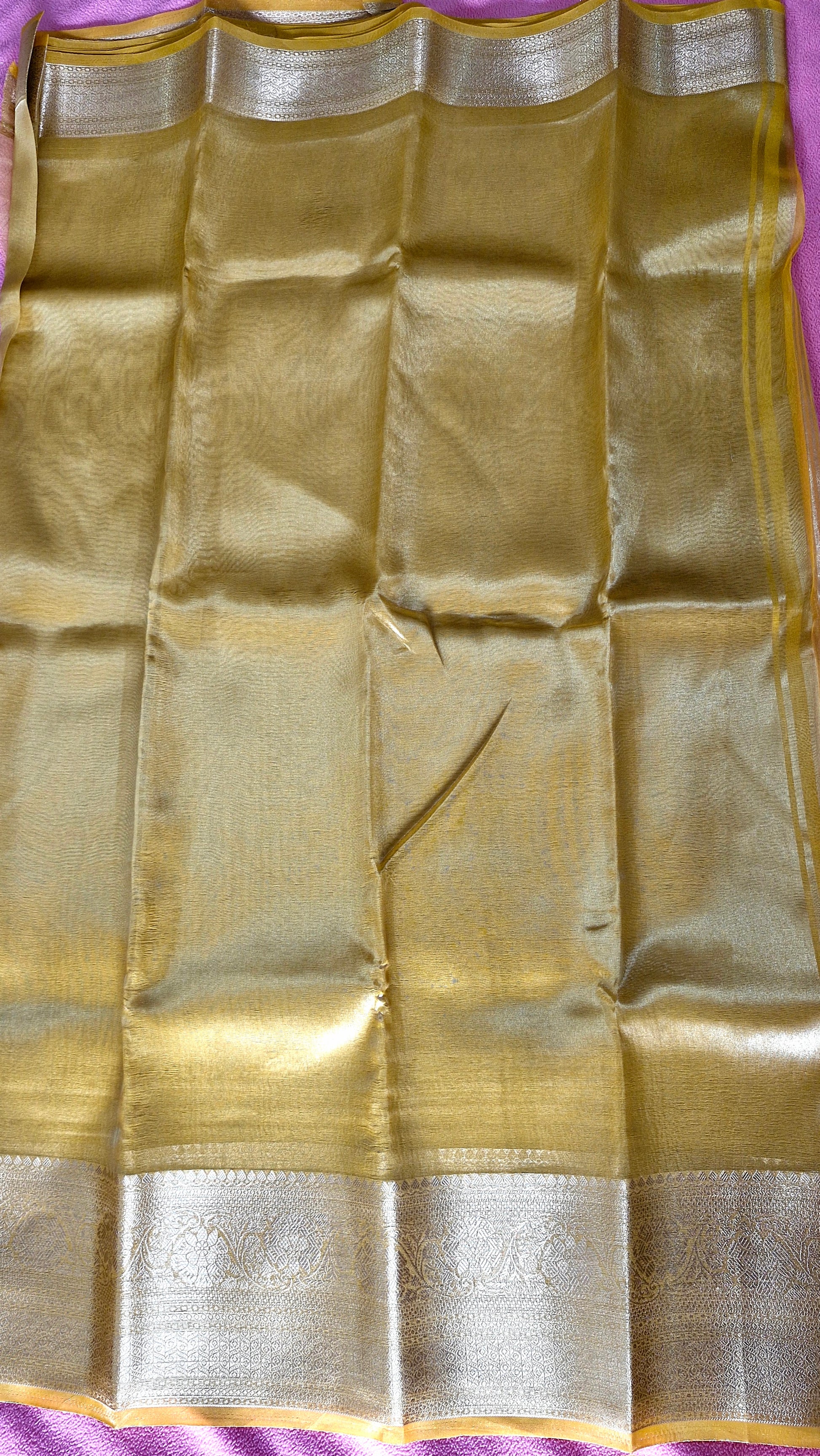 "Radiate timeless elegance in this golden yellow organza saree, highlighted by an exquisite golden border for a refined, luxurious look."