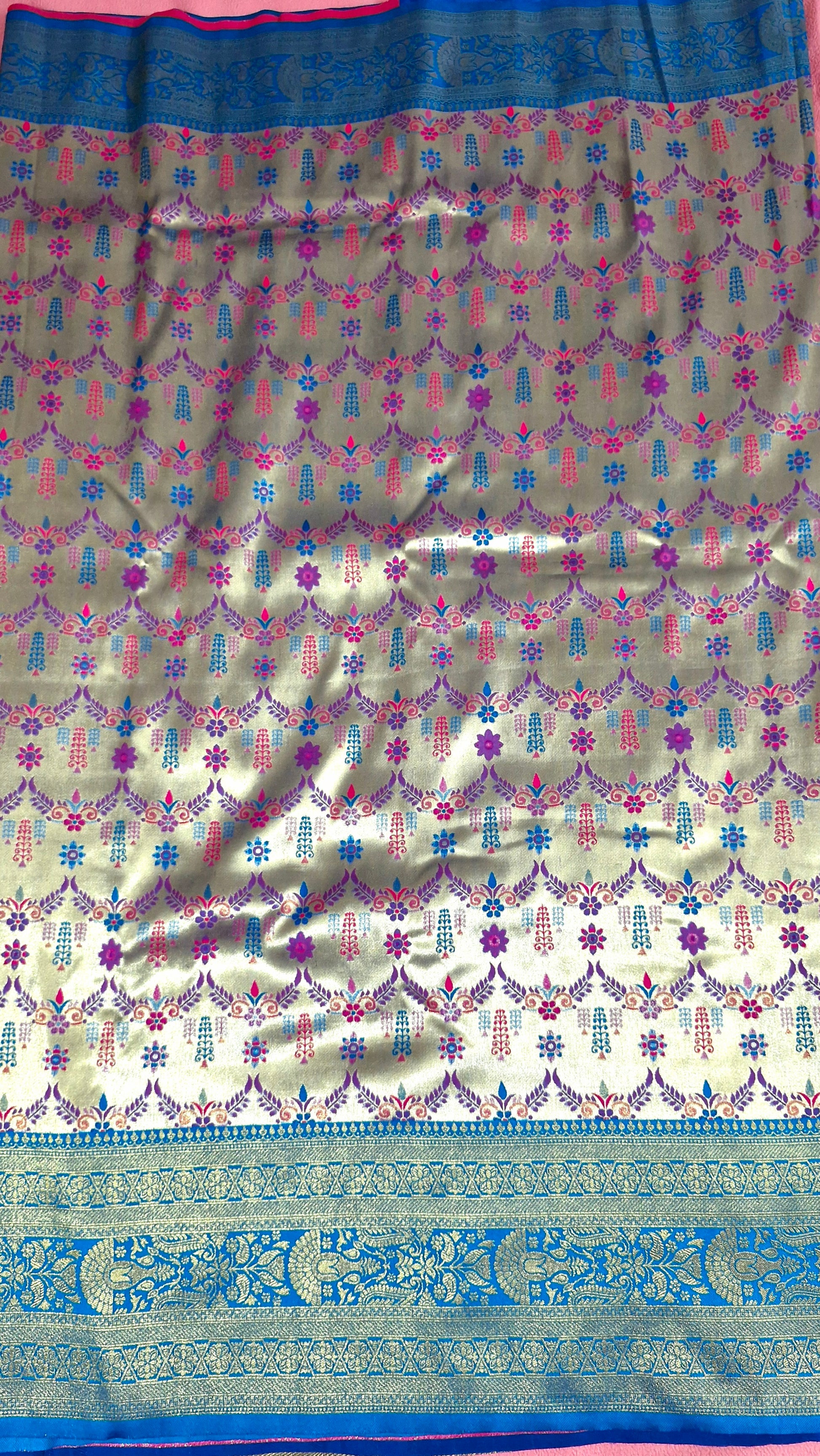Grace meets glamour in this stunning Silver-Gold Dual Tone saree, featuring intricate designs and a rich blue border. Perfect for any grand occasion.